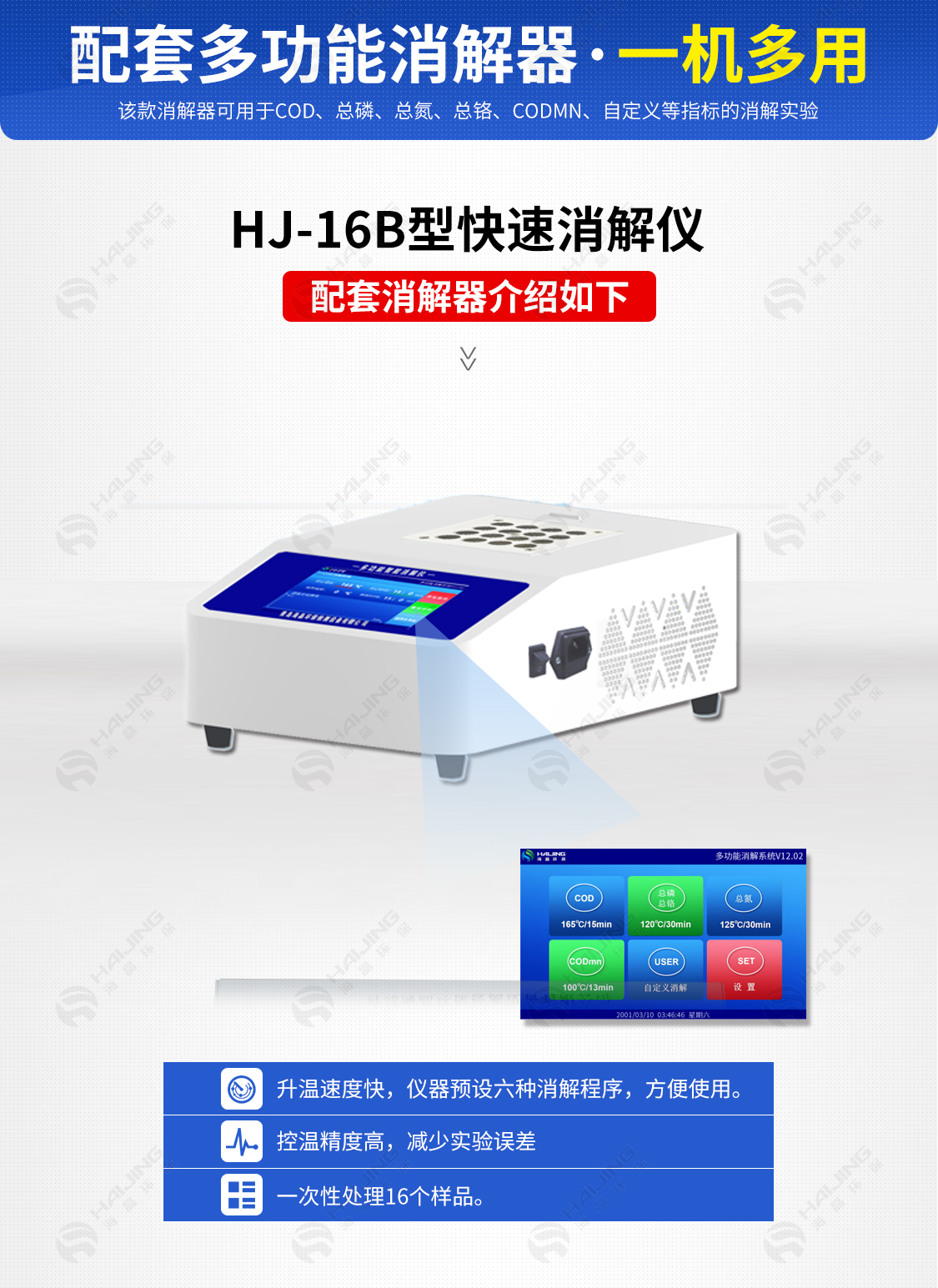 14、配备专用多参数智能消解仪,一次性处理十几个样品,大大提高实验效率。