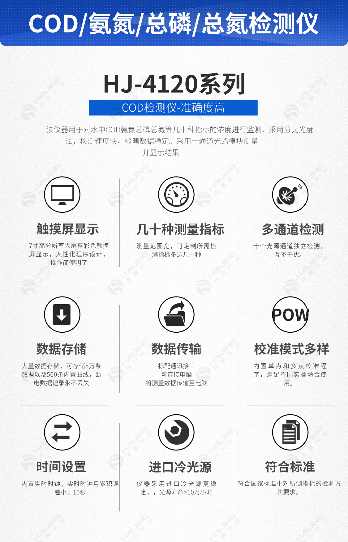 HJ-4120系列智能水质分析仪是我公司推出的一款智能彩色触摸屏检测仪器。可供检测水中COD、氨氮、总磷、总氮等几十种参数指标。该仪器采用触摸式设计,全中文程序设计,更好的提高了用户体验。并且仪器应用改进光路系统,消解比色一管完成,大大减小了实验误差,使操作更加方便。该仪器一经推出,便广受欢迎。被广泛应用于污水厂、企业、第三方检测等单位。